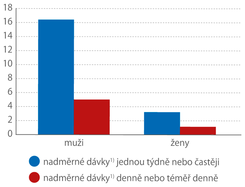 Míra užívání alkoholu v dospělé populaci je v Česku vysoká. Denně nebo téměř denně ho pije 6–11 % dospělých osob, 11–19 % mužů a 4–5 % žen. Časté pití nadměrných dávek alkoholu při jedné příležitosti (alespoň jednou týdně nebo častěji) uvádí 10–13 % dospělých (16–21 % mužů a 3–7 % žen). Rizikově konzumuje alkohol 15–18 % populace starší 15 let (odhadem 1,3–1,6 mil. osob), přičemž do kategorie škodlivé konzumace alkoholu spadá 6–10 % dospělých (tj. 600–900 tis. osob).