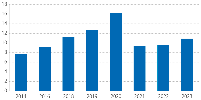 Mezi lety 2014 a 2020 míra denní konzumace alkoholu rostla, v roce 2021 došlo k výraznému poklesu. V dalších dvou letech se však míra denního pití opět lehce zvýšila.