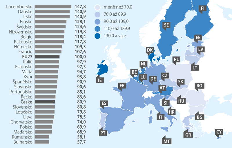 Česko dosáhlo v roce 2024 reálné úrovně HDP na hlavu ve výši 91 % průměru EU. Výsledek se tak ve srovnání s rokem 2023 nezměnil a drží se pod úrovní, kterou měl před příchodem pandemie (96 % v roce 2019). Ze zemí, které do EU vstoupily po roce 2000, nás překonaly Malta (110 %) a Kypr (99 %). Ze starších členských zemí se pod Českem umístily Portugalsko (82 %) a Řecko (69 %). Nejvyšší úroveň HDP na hlavu mělo Lucembursko (245 % průměru EU), nejnižší Bulharsko (66 %). Oproti HDP poskytuje lepší obrázek životní úrovně skutečná reálná spotřeba na hlavu.