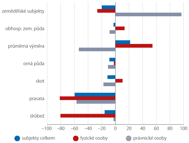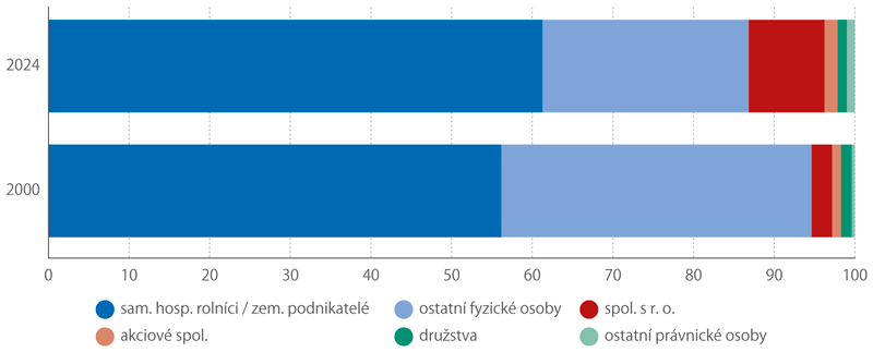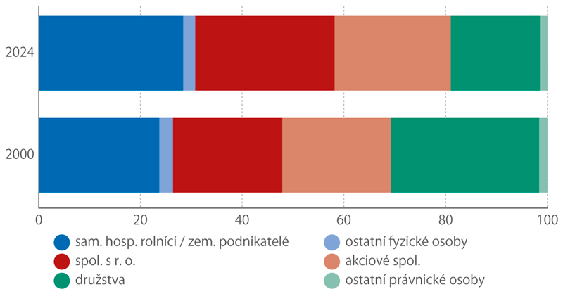 V roce 2024 zahrnoval Zemědělský registr 45 249 subjektů a 3 547 tis. ha zemědělské půdy, během posledních 25 let tedy ubylo 19,1 % subjektů a 2,6 % půdy. Došlo k významným změnám v zastoupení jednotlivých typů právních forem a přesuny zemědělské půdy mezi nimi. Úbytek o čtvrtinu (−26,5 %) postihl subjekty fyzických osob, naopak počet subjektů právnických osob se téměř zdvojnásobil (+96,8 %). Právní forma samostatně hospodařící rolník v období 2004−2009 zanikla a na jejich místo nastoupili zemědělští podnikatelé, jichž bylo v roce 2024 o 12,6 % méně než samostatně hospodařících rolníků v roce 2000. Ostatních subjektů fyzických osob však zbyla jen polovina (−46,8 %). Přírůstek mezi subjekty právnických osob způsobily především společnosti s r. o., jejichž počet se bezmála ztrojnásobil (+195,4 %); právě tuto právní formu zvolila pro své podnikání značná část dřívějších subjektů fyzických osob kvůli výhodnějším právním, daňovým a jiným podmínkám. Vzrostl i počet akciových společností (+19,3 %), naproti tomu počet družstev se snížil o necelou třetinu (−30,8 %). Část zemědělské půdy se přesunula k subjektům fyzických osob (+13,5 %). V rámci subjektů právnických osob významně přibyla zemědělská půda společnostem s r. o. (+21,4 %) a v menší míře i akciovým společnostem (+3,7 %), naopak družstva o dvě pětiny své půdy (−40,8 %) přišla.