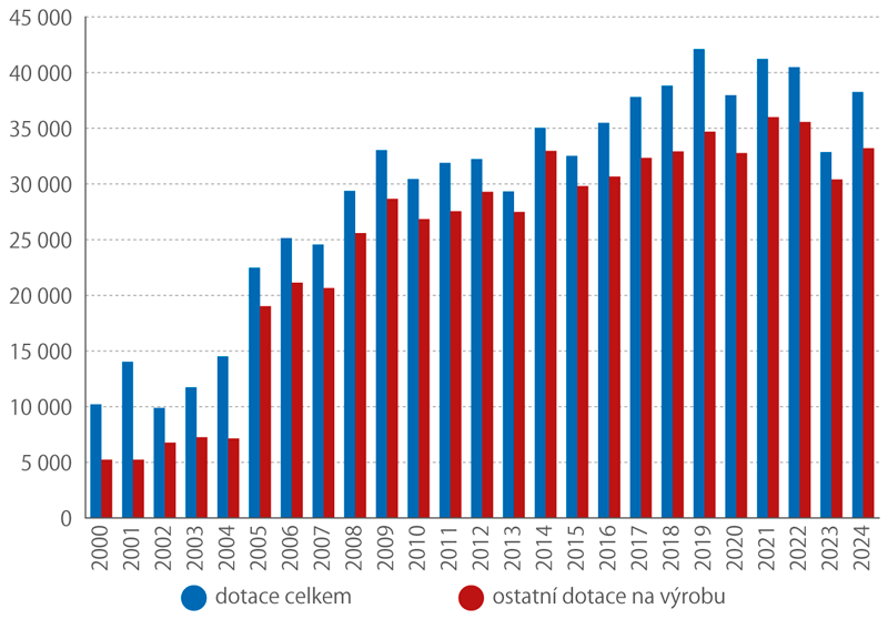 Během uplynulého čtvrtstoletí objem a důležitost dotací vstupujících do zemědělského sektoru několikanásobně vzrostly a změnila se i jejich struktura. Vezmeme-li finanční údaje v běžných cenách, pak v roce 2000 SZÚ evidoval celkem 10 196 mil. Kč vyplacených dotací, z toho 5 225 mil. Kč (51,2 %) ostatních dotací na výrobu a dalších 2 694 mil. Kč (26,4 %) ostatních kapitálových transferů. Podle semidefinitivních výsledků za rok 2024 již celkový objem dotací činil 38 261 mil. Kč a podíl ostatních dotací na výrobu výrazně narostl na 86,8 % celkových dotací, přičemž právě se vstupem do Evropské unie došlo ke skokovému navýšení. Naproti tomu ostatní kapitálové transfery ztratily na významu a jejich podíl v několika posledních letech nepřesahuje 1 %. V přepočtu na výměru obhospodařované zemědělské půdy obdrželi zemědělci v roce 2000 průměrně 2 799 Kč/ha, v roce 2024 průměrně 10 787 Kč/ha. Jak bude dotační politika v zemědělství vypadat v blízké i vzdálenější budoucnosti, je v současnosti předmětem rozsáhlých diskuzí jak na unijní, tak na národní úrovni.