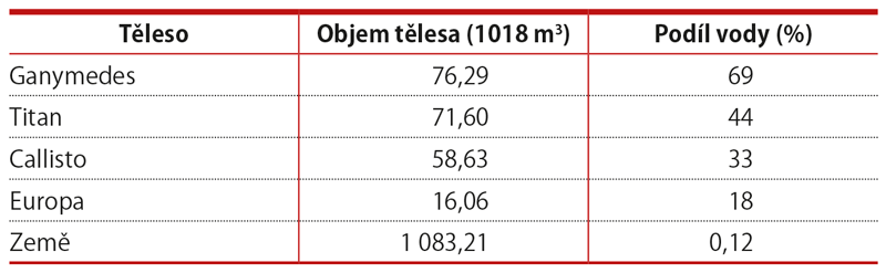 Podíl vody na objemu vybraných těles sluneční soustavy