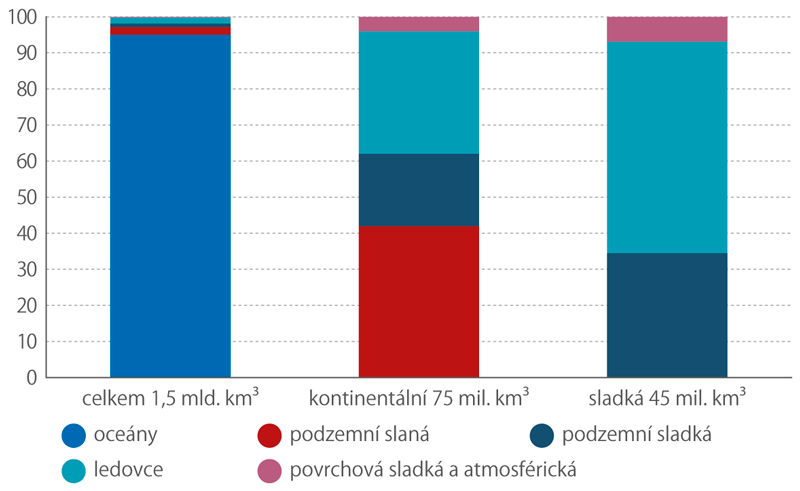 Zásoby vody na Zemi se odhadují na 1,5 mld. km3. Drtivou většinu z toho (95 %) tvoří slaná voda v oceánech. Přibližně 3 % světových zásob vody se nacházejí ve formě vody podzemní, přičemž zhruba dvě třetiny jsou rovněž slané. Sladkou vodu najdeme kromě podzemí zejména v ledovcích (1,7 %) a pouze méně než 0,2 % zbývají na sladkou vodu povrchovou a atmosférickou.