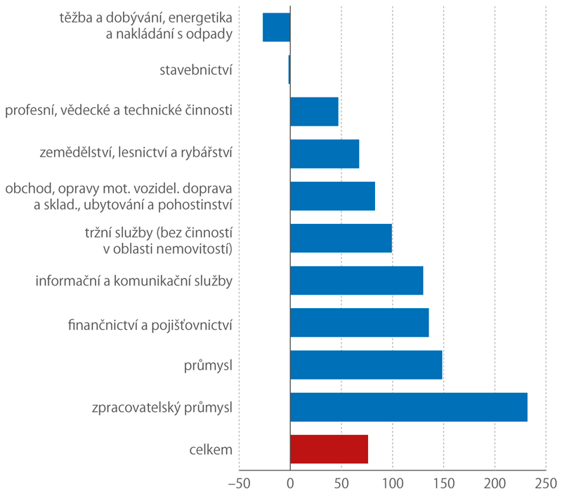 Zatímco před rokem 2009 zlepšování produktivity v Česku předbíhalo jiné vyspělé země, a Česko se tak výkonností blížilo západní Evropě, po recesi se už tato tempa neobnovila. Po roce 2010 přebraly roli tahouna růstu produktivity od zpracovatelského průmyslu služby. Mezi nimi vynikalo peněžnictví a pojišťovnictví, ale rovněž informační a komunikační činnosti, které se v posledních dvaceti letech stabilně rozvíjely. Impulz dostaly rovněž v souvislosti s pandemií covidu-19.