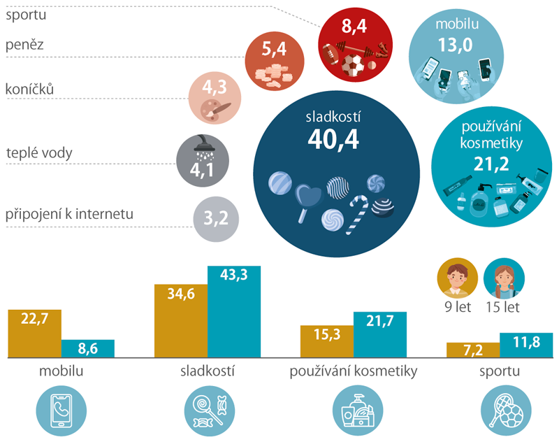 Z dat je patrné, že internet je pro většinu dětí téměř nepostradatelný. Internet a elektronická zařízení patří u dětí dlouhodobě mezi největší lákadla. Více než třetina dětí by se na měsíc dokázala vzdát sladkostí a pětina kosmetiky, ale bez internetu by vydržela pouze tři procenta. Podobně jen desetina by se dokázala vzdát svého mobilního telefonu.