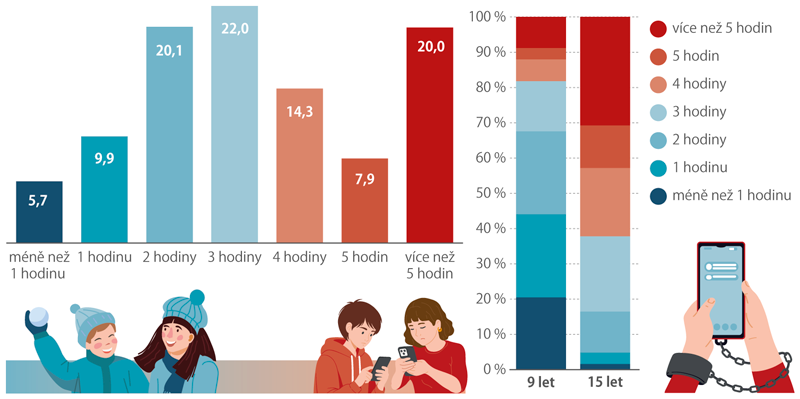 Pokud jde o čas strávený online, děti nejčastěji uvádějí tři hodiny denně, což je o hodinu více než v roce 2020, kdy proběhlo předchozí Minisčítání. Pětina všech dětí zároveň tráví každý den na internetu déle než pět hodin. Značné rozdíly však vidíme mezi věkovými skupinami. U patnáctiletých žáků jsou online aktivity už velmi rozšířené, takže třetina z nich je na internetu déle než pět hodin denně, zatímco méně než hodinu tráví online jen 2 % patnáctiletých. U devítiletých dětí je situace trochu lepší, protože více než pět hodin denně „žije“ online pouze necelá desetina z nich – tedy podobně, jako tomu bylo před pěti lety. Naproti tomu kratší dobu než hodinu denně tráví na internetu přibližně pětina nejmladších respondentů.