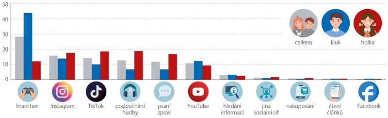 Mezi sociálními sítěmi hrají prim Instagram a Tik-Tok. Když děti hledají zábavu nebo sledují videa, jednoznačně vede YouTube, který využívá téměř polovina z nich. Chlapci tráví na YouTube více času než dívky, ale i u dívek patří YouTube mezi hlavní zdroje zábavy. Televize jako médium v tomto směru téměř ztrácí význam – pro sledování videí nebo zábavného obsahu ji využívají jen čtyři procenta dětí.