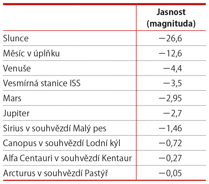 U velmi jasných těles nabývá jasnost záporných hodnot. Nejjasnější hvězda Sirius má jasnost –1,5 magnitudy, Měsíc v úplňku dosahuje hodnoty –12,7 a Slunce –26,7.