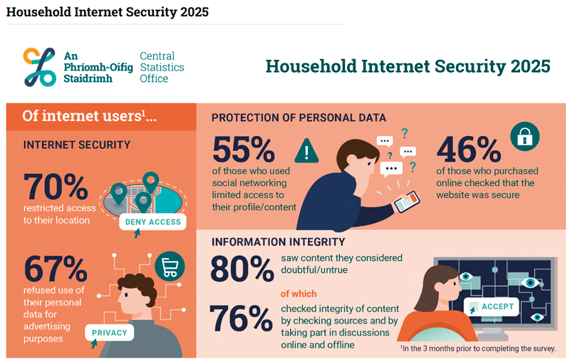 V Irsku 70 % uživatelů omezilo přístup k údajům o své poloze a 67 % odmítlo poskytnout své osobní údaje pro reklamní účely. Přístup ke svému profilu nebo obsahu tam omezila více než polovina uživatelů sociálních sítí (55 %). Při online nakupování si 46 % lidí ověřovalo, zda je webová stránka bezpečná. Velká většina uživatelů (80 %) se během tří měsíců před průzkumem setkala s obsahem, který považovali za pochybný nebo nepravdivý. Z těch, kteří na pochybný obsah narazili, se 76 % aktivně snažilo ověřit jeho pravdivost, a to buď kontrolou zdrojů, nebo diskuzí o daném tématu online či offline.