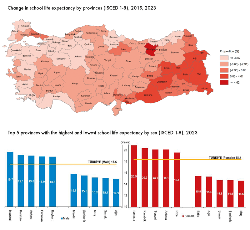 V Turecku byla v roce 2023 očekávaná délka školní docházky celkem 17,9 let, přičemž ženy by ve škole v průměru strávily delší dobu než muži (18,4 oproti 17,6 roku). Nejvíce let ve škole mají před sebou děti, které v roce 2023 nastoupily na základní školu v Istanbulu (průměrně 20,3 roku), následovala provincie Karabük s 19,7 roku, Ankara s 19,6 roku, Rize a Erzincan s 19,1 roku. Na- proti tomu provincie s nejnižší střední délkou života ve školách byly Muş a Şırnak se 14,9 roku, následované Ağrı a Şanlıurfou s 15,1 roku.