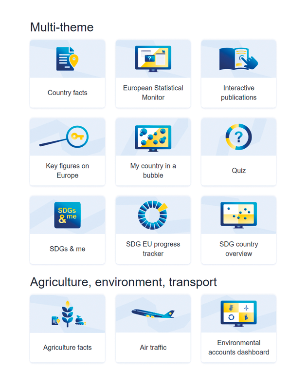 Pokud chcete získat obecný přehled o situaci a vývoji v EU, je tím pravým místem, kde začít, interaktivní vizualizace Klíčové údaje o Evropě. Vhodné nástroje nabízí Eurostat i pro ty, kteří mají zájem ponořit se do konkrétních témat hlouběji. Panel digitalizace např. umožňuje sledovat vývoj digitálních dovedností a digitalizaci podniků, veřejných služeb a infrastruktury na úrovni EU a ve vybraných zemích. Nebo můžete použít nástroj SDGs & me pro sledování pokroku zvolené země v oblasti cílů udržitelného rozvoje. Dokonce si můžete otestovat své předpovědi týkající se trendů.