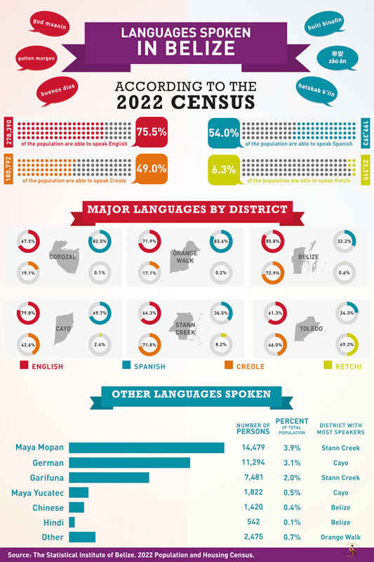 To dokazuje fakt, že oficiálním úředním jazykem je sice angličtina, kterou podle sčítání z roku 2022 umí více než 75 % tamních obyvatel, ale více než polovina (54 %) používá španělštinu a necelá polovina (49 %) pak belizskou kreolštinu. Bez zajímavosti jistě není ani skutečnost, že více než 3 % Belizanů mluví německy, a tak by nemělo nikoho překvapit, že na pozdrav good mornig mu soused odpoví buenos días, gud maanin nebo třeba Gutten Morgen. A jak se po ránu zdraví v jazyce ketchi? To se budete muset do Belize vypravit, nejlépe do oblasti Toledo, kde tímto jazykem mluví každý druhý.