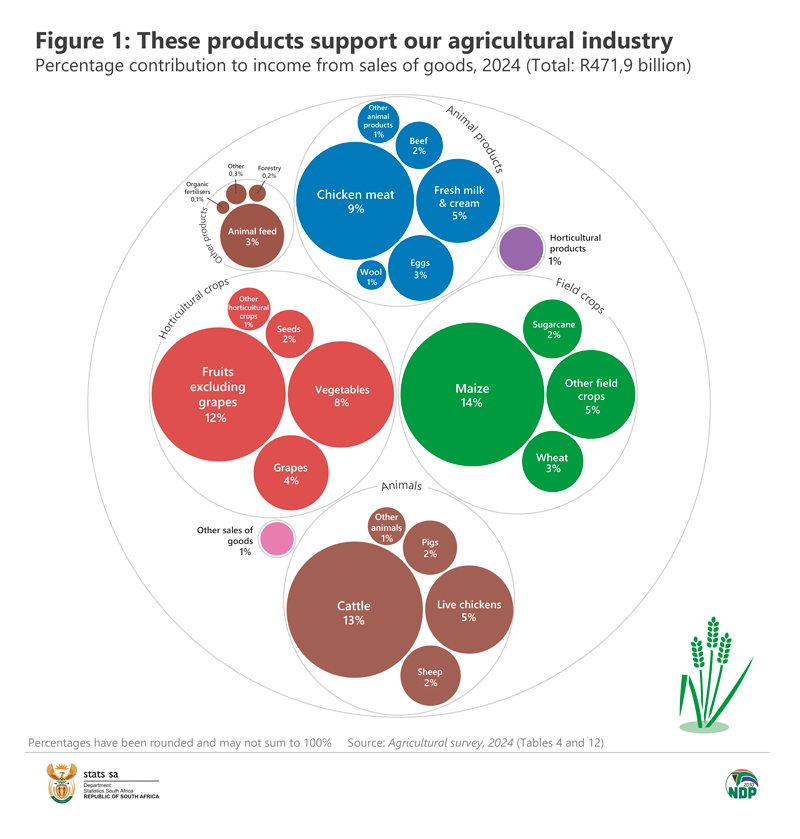 Důležitost rostlinné výroby pro jihoafrickou ekonomiku vyplývá i z nedávno zveřejněných údajů statistického úřadu Jižní Afriky o komerčním zemědělství za rok 2024. Zahradnické plodiny představovaly největší podíl na příjmech z prodeje zemědělských produktů, a to 27 % z celkového objemu. Druhým nejvýznamnějším přispěvatelem byla kategorie polních plodin (24 %). Následovala zvířata (23 %) a živočišné produkty (20 %).