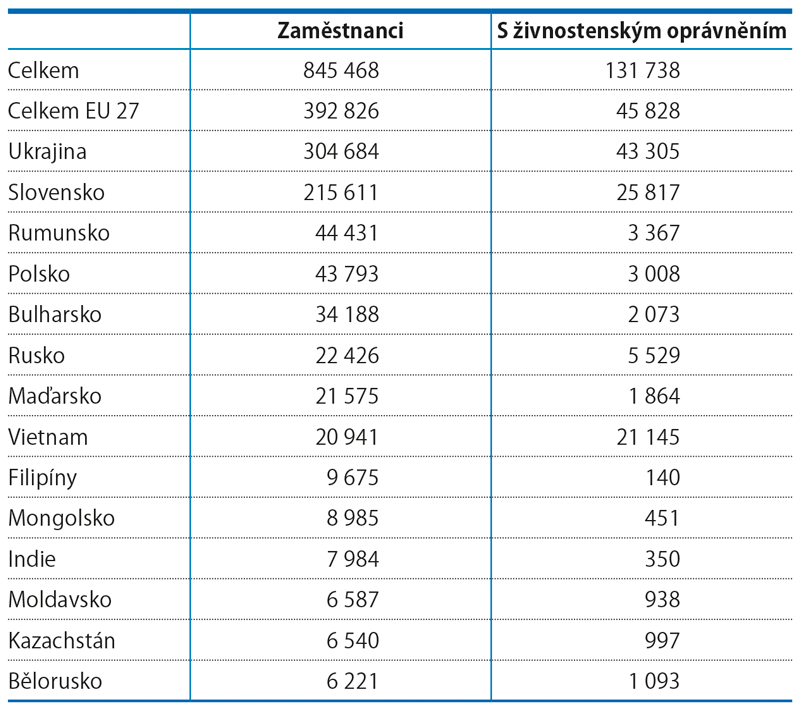 V roce 2024 bylo na úřadech práce evidováno celkem 845 468 pracovněprávních vztahů cizinců v postavení zaměstnanců a dalších 131 738 osob mělo živnostenské oprávnění. Jak počty pracovněprávních zaměstnaneckých vztahů cizinců, tak počty cizinců držitelů živnostenského oprávnění v roce 2024 meziročně vzrostly, a to o 2,6 %, respektive o 11,3 %.