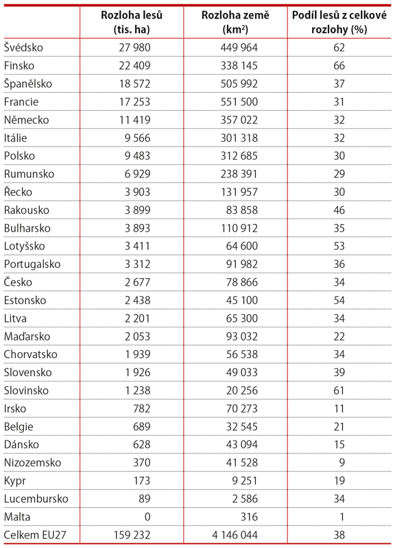 Lesy v Evropské unii zaujímají plochu zhruba 160 milionů hektarů a jejich rozloha se stále zvětšuje. Nejvyšší podíl na této ploše zaujímá Švédsko (17,6 %), nejnižší Malta (0,0 %). Česko se nachází uprostřed s podílem 1,7 % (2,7 mil. ha). V rámci Evropy nejsou lesy rovnoměrně rozmístěny, téměř třetina lesů EU se nachází ve Švédsku a Finsku.