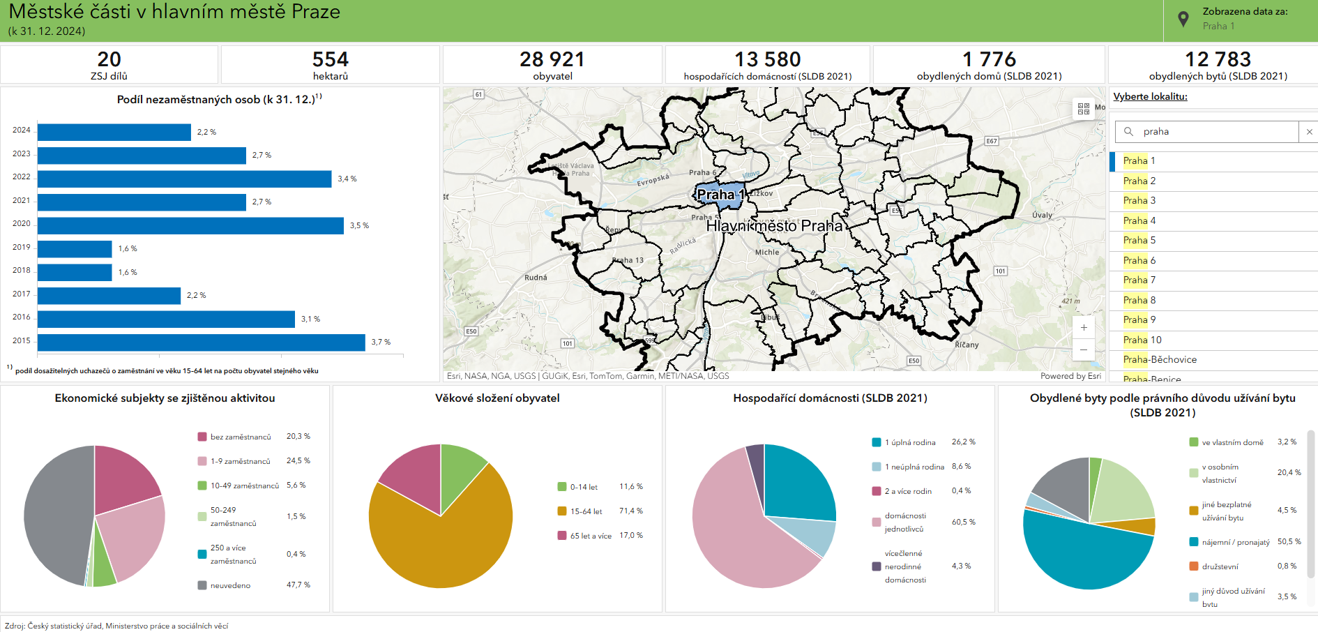 Populačně největší městskou částí byla koncem roku 2024 Praha 4 s 135,7 tisíci obyvateli. Největší hustotu zalidnění mají centrální části Prahy, městské části Praha 3, Praha 2 a sídlištní Praha 11. Nejvíce osob s vysokoškolským vzděláním bydlí v městských částech Praha-Troja (47,5 % osob z obyvatel se zjištěným vzděláním) a Praha-Lysolaje (46,7 %), naopak nejméně v Praze-Nedvězí (19,5 %). V některých městských částech tvoří většinu obydlených domů rodinné domy. Jsou to okrajové Praha-Křeslice (97,9 % z obydlených domů), Praha-Nebušice (97,7 %) nebo Praha-Benice (97,5 %). Naopak v centrálních částech převládají domy bytové. V Praze 7 jich je dokonce 92,9 % a v Praze 2 pak 91,8 % z obydlených domů.