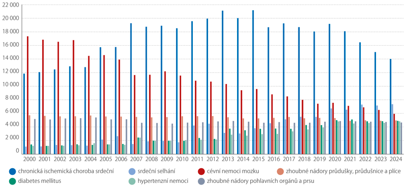 Prvních pět nejčetnějších příčin smrti a jejich pořadí se v roce 2024 meziročně nezměnilo. První pozici opět zaujala chronická ischemická choroba srdeční, na niž zemřelo 14,0 tisíce osob (12,5 %). Na druhém místě šlo o srdeční selhání se 7,3 tisíce zemřelých (6,5 %) a na třetím místě o cévní nemoci mozku s 5,9 tisíce zemřelých (5,3 %). Čtvrtou nejčastější příčinou smrti byly zhoubné novotvary průdušky, průdušnice a plíce (4,4 %) a pátou, se stejným podílem úmrtí, diabetes mellitus.