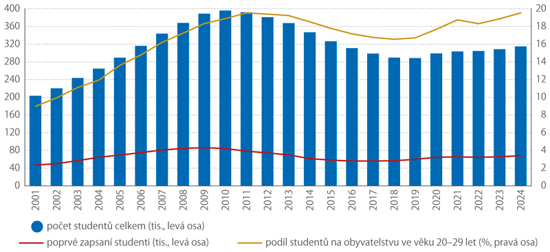 V letech 2001 až 2010 se počet studentů veřejných a soukromých vysokých škol v Česku každoročně zvyšoval, a sice z 203 449 v roce 2001 na 395 985 v roce 2010. V druhé dekádě tohoto tisíciletí pak klesal až na 288 579 v roce 2019. Od roku 2019 studentů veřejných a soukromých vysokých škol opět přibývá a koncem roku 2024 jich bylo již 314 850*.