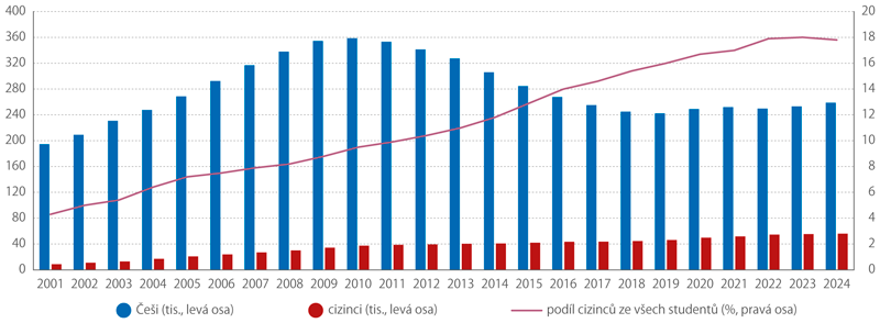 Mezi studenty vysokých škol v České republice bylo na konci roku 2024 celkem 55 996 cizinců. Jejich počet roste nepřetržitě od roku 2001, odkdy existují srovnatelné údaje. Poprvé však byl meziroční procentuální nárůst počtu vysokoškolských studentů cizí státní příslušnosti (o 1,1 %) nižší než u českých studentů (o 2,3 %). Českých studentů meziročně přibylo bezmála šest tisíc (5 709), zatímco studentů cizí státní příslušnosti zhruba šest set (613). Z tohoto důvodu mírně poklesl podíl cizinců na celkovém počtu všech studentů vysokých škol, a sice z 18,0 % na 17,8 %. Ačkoli se jedná pouze o nepatrný rozdíl, jde o první snížení podílu od roku 2001.