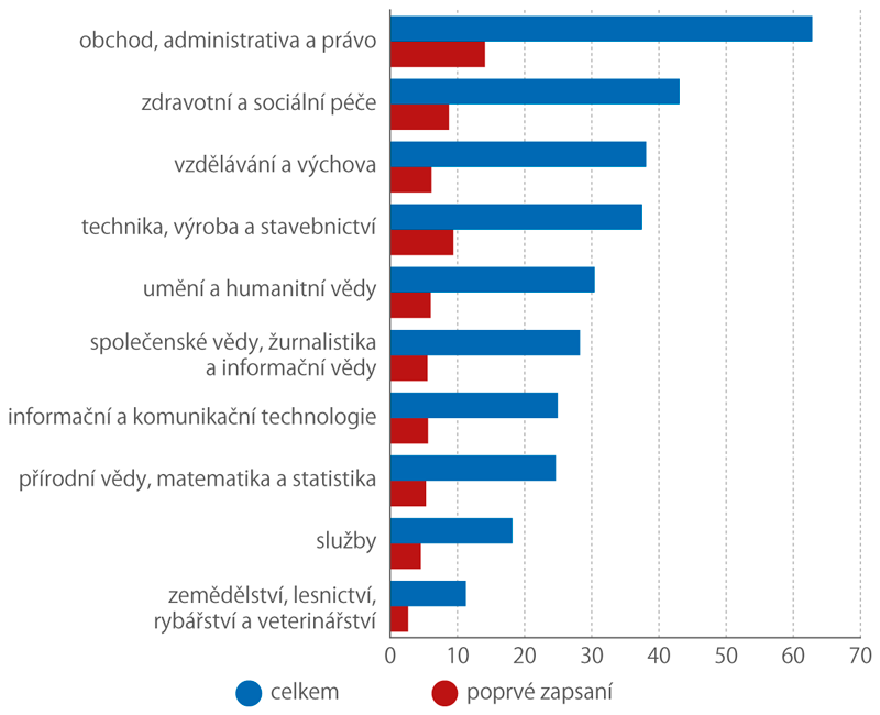 V oblasti vzdělávání a výchovy dochází přitom k úbytku počtu poprvé zapsaných studentů na vysoké školy již čtvrtým rokem v řadě, v oblasti informačních a komunikačních technologií a zemědělských oborů druhým rokem v řadě. Je třeba také dodat, že snížení počtu poprvé zapsaných studentů na vysokou školu do oborů z oblasti informačních a komunikačních technologií za poslední dva roky bylo způsobeno především cizinci, jejichž počet v této skupině oborů klesl o 24,2 %. Počet českých poprvé zapsaných studentů na vysokou školu studujících tyto obory se naopak za poslední dva roky o 7,6 % zvýšil.