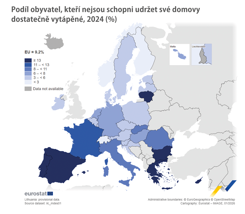 V roce 2024 nebylo 9,2 % obyvatel EU schopno dostatečně vytápět své domovy. Ve srovnání s rokem 2023 to představuje zlepšení o 1,4 procentního bodu.