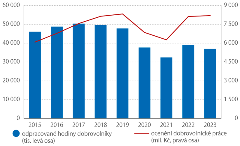 V roce 2023 počet dobrovolnicky odpracovaných hodin poklesl o 5,6 % na 37 milionů. Ocenění dobrovolnické práce oproti roku 2022 mírně vzrostlo o 70 mil. Kč na 8,2 mld. Kč. Tento nárůst je dán metodou ocenění dobrovolnické práce, při níž se počet hodin odpracovaných dobrovolníky násobí mediánem hodinové mzdy z Informačního systému průměrného výdělku (ISPV). Tento medián v roce 2023 vzrostl na 221,8 Kč (z 207,5 Kč v roce 2022).