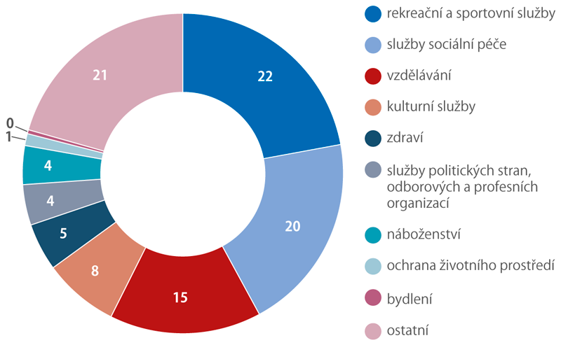 Dalším přínosem SÚNI je sledování účelu vynakládání prostředků neziskových institucí (rozdělení dle klasifikace CZ-COPNI). Přes 22 % své produkce směřují na podporu sportovních a zájmových činností, a 20 % pak na služby sociální péče, zahrnující jak pobytové, tak ambulantní sociální služby. Třetí největší oblastí pak je vzdělávání (15 %), přičemž největší část prostředků jde na ostatní vzdělávání – různé kurzy a vzdělávání nejen dětí, ale i dospělých. Přes 20 % směřuje do části ostatní, do níž zahrnujeme např. regionální rozvoj, ochranu lidských práv nebo humanitární pomoc jiným zemím.