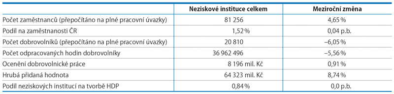 Neziskové instituce se v roce 2023 podílely na tvorbě hrubého domácího produktu 0,8 %. Jejich produkce, tedy souhrn všech poskytovaných produktů a služeb, dosáhla 125,1 mld. Kč. Více než 96 % této hodnoty vytvořily netržní neziskové instituce, tedy ty, které poskytují své služby domácnostem. Z jejich produkce bylo 80 mld. Kč (66,6 %) poskytnuto bezplatně a 27 mld. Kč (22,6 %) za netržní ceny, tedy za ceny, které slouží k pokrytí výrobních nákladů nebo jsou nižší.