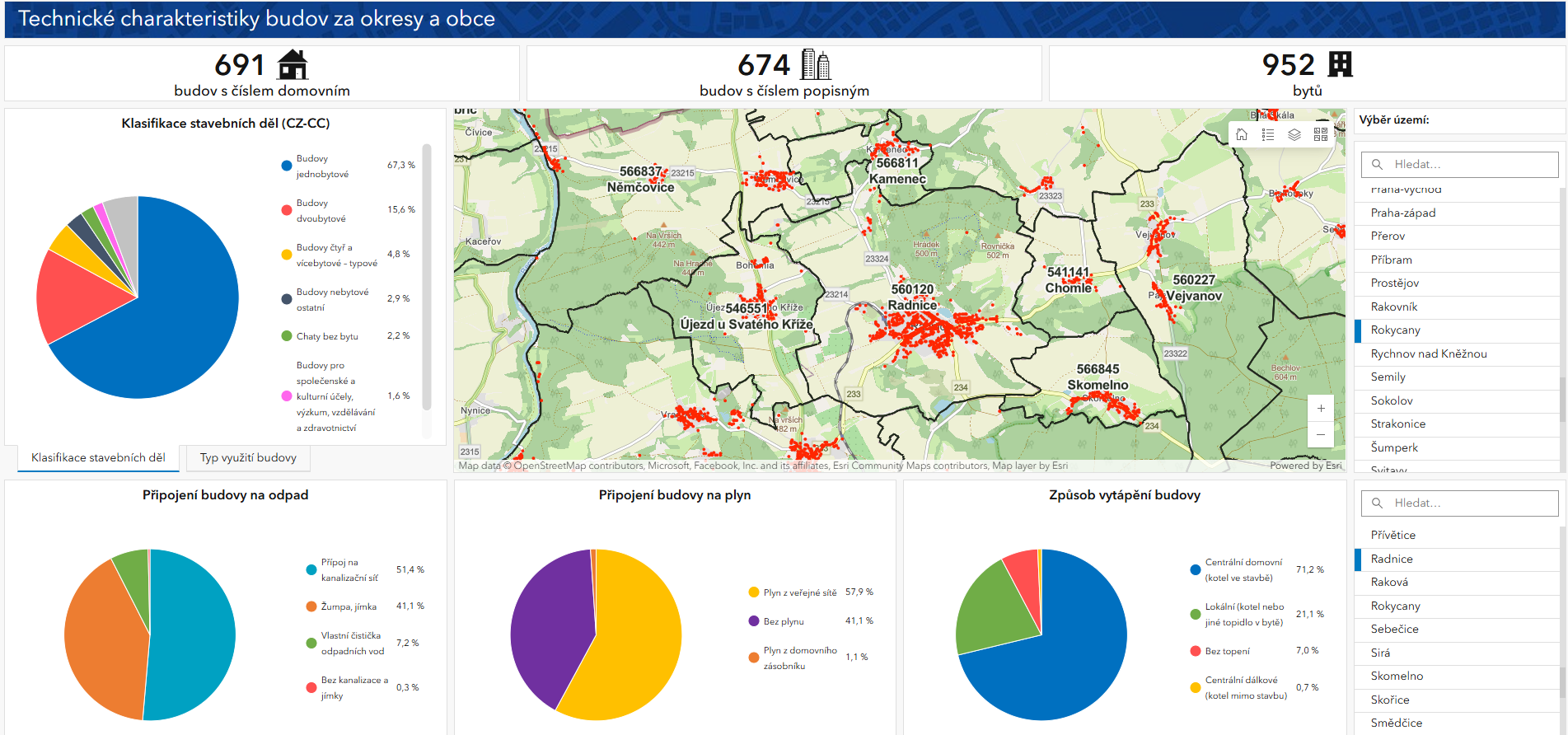 Na mapovém podkladu si můžete zvolit území okresu či obce. První dashboard je zaměřen na technické charakteristiky budov napočítávané dle jejich aktuální evidence v Registru sčítacích obvodů (ke dni zveřejnění tohoto textu se jedná o údaje k 1. 10. 2025). Druhý dashboard zobrazuje souhrnné a průměrné statistiky za území a charakter základních sídelních jednotek. Uživatelé si tak mohou v grafech zobrazit počet a podíl budov v jejich obci podle typu využití budovy, způsobu vytápění či připojení na plyn nebo odpad.