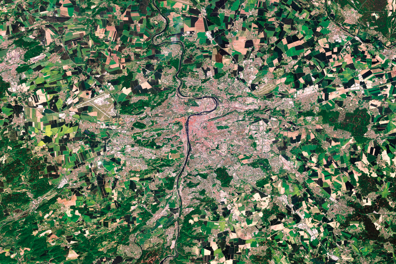 Praha a její blízké okolí, jak je vidět z družice Sentinel-2.