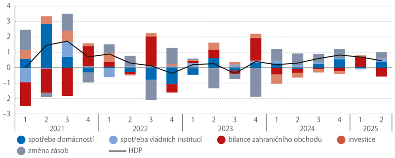 Česká ekonomika letos navázala na druhou polovinu roku 2024, kdy došlo k oživení dynamiky hrubého domácího produktu. Ve 2. kvartálu 2025 vzrostl HDP mezičtvrtletně o 0,5 % a meziročně o 2,6 %. Mezičtvrtletní přírůstek mírně zpomalil oproti předchozím obdobím (0,8 % na konci roku 2024 a 0,7 % v 1. čtvrtletí 2025). Domácí poptávka ale výrazně posílila, zejména díky domácí spotřebě a tvorbě zásob. Druhé čtvrtletí v řadě mírně mezičtvrtletně rostla také investiční aktivita.