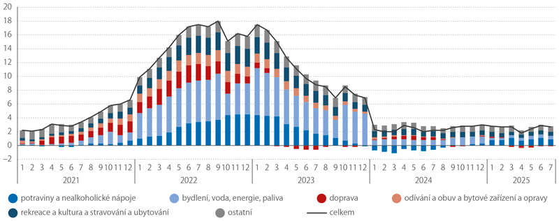 Aktuálně mají nejsilnější vliv na celkový růst spotřebitelských cen potraviny a nealkoholické nápoje. Více než 5% meziroční růst cen potravin pohánějí zejména ceny mléka, sýrů a vajec a olejů a tuků (máslo). Rostou ale také ceny masa a pekárenských výrobků. Silný vliv na celkový růst spotřebitelských cen si drží i alkoholické nápoje a tabák. Významný dopad má váhově nejvýznamnější část spotřebního koše – bydlení a energie, kde po útlumu z loňska posílil meziroční cenový růst na 1,9 % ve 2. čtvrtletí.