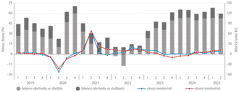 Bilance zahraničního obchodu se zbožím a službami v běžných cenách ve 2. čtvrtletí dosáhla přebytku 118,7 mld. Kč (meziročně –11,1 mld. Kč). Zhoršení bilance obchodu se zbožím bylo plošné u většiny artiklů, nejvíce se zhoršovala bilance obchodu s ropou a zemním plynem (poprvé od 4. čtvrtletí 2022). Dále se výrazně meziročně zhoršil výsledek obchodu s kovodělnými výrobky a elektrickými zařízeními. Naopak se značně navýšil přebytek obchodu s motorovými vozidly a solidní zlepšení vykázal také výsledek obchodu s koksem a rafinovanými ropnými výrobky, ostatními dopravními prostředky a zařízeními a počítači, elektronickými a optickými přístroji.
