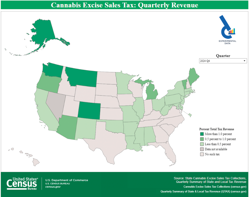 Americký úřad pro sčítání lidu vydal nový experimentální datový produkt, který obsahuje údaje o výběru daní z prodeje konopí na úrovni jednotlivých států.