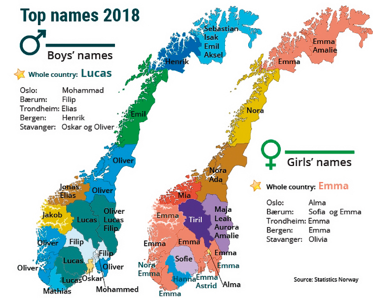 Norské děti dostávaly v loňském roce nejčastěji jméno Emma nebo Lucas/Lukas. Nebylo tomu TAK ALE ve všech částech Norska.