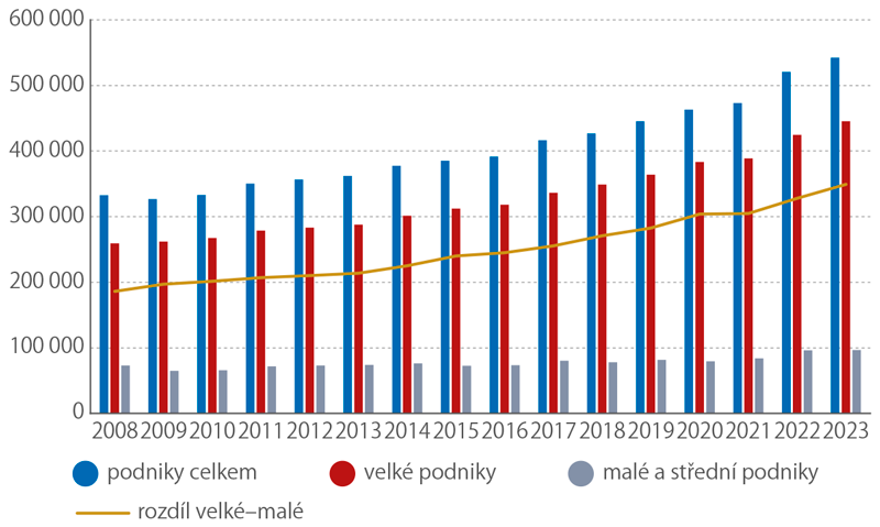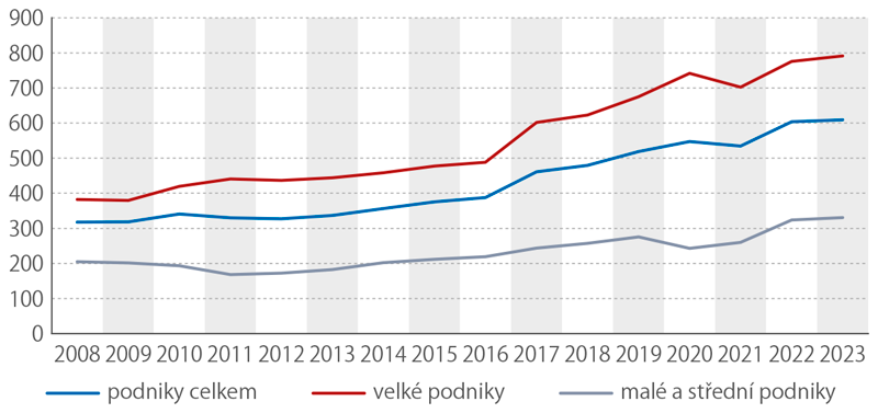 Přidaná hodnota je definována jako podíl výkonů včetně obchodní marže po odečtení spotřeby materiálu, energie a nákladů na služby a vztahuje se na jednu zaměstnanou osobu. Nejvyšší údaj najdeme u velkých podniků s více než 250 zaměstnanými osobami, kde v roce 2023 překročila 790 tis. Kč. Její vývoj se do roku 2016 vyznačoval pozvolným zvyšováním, od roku 2017 nabral růst rychlejší tempo, které s výjimkou drobného propadu v roce 2021 pokračovalo až do konce sledovaného období. U malých a středních podniků přidaná hodnota do roku 2011 mírně klesala. Od té doby, s výjimkou let 2021 a 2022, pomalu rostla, nikdy ale nedosáhla úrovně velkých podniků.