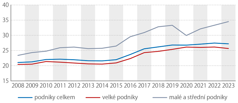 Průměrné měsíční mzdy přepočtené na jednu fyzickou osobu z počátku rostly v obou velikostních skupinách podobným tempem. Od roku 2018 však průměrná měsíční mzda rostla u malých a středních podniků pomaleji než u velkých. Mezi lety 2008 a 2023 se průměrná měsíční mzda zvýšila u malých a středních podniků o 9,6 tis. Kč na přibližně 21 tis. Kč na fyzickou osobu a u velkých podniků s 250 a více zaměstnanými osobami o 18,0 tis. Kč na zhruba 35 tis. Kč.