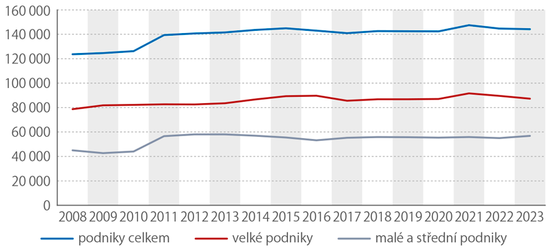 Počet zaměstnaných osob ve velkých podnicích1) se mezi lety 2008–2023 zvýšil o 8 670. Celkový počet zaměstnaných osob v segmentu od roku 2008 do roku 2011 mírně rostl, následně se držel zhruba na stejné úrovni. Více zaměstnaných osob vždy působilo ve velkých podnicích. V roce 2023 bylo zaměstnaných osob v malých a středních podnicích2) 56 871, ve velkých pak 87 326.