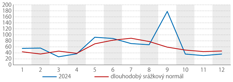 Podle hydrologické bilance vody České republiky, kterou zpracovává Český hydrometeorologický ústav, činil v roce 2024 srážkový úhrn 776 mm, což odpovídá 114 % dlouhodobého normálu. Na celé Česko se tak za uvedený rok vylilo zhruba 85 plných nádrží Orlické přehrady.