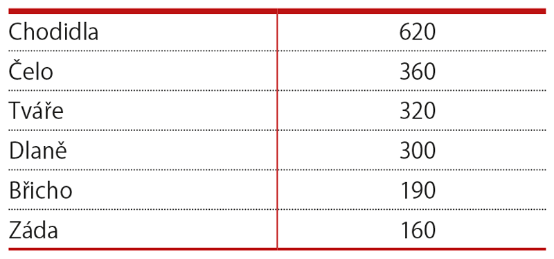 Průměrné počty potních žláz na cm2 lidského těla