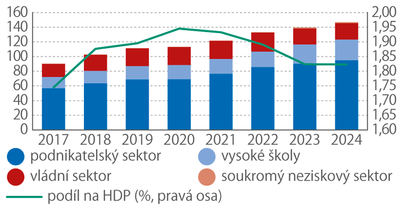 V roce 2024 vzrostly meziročně výdaje na výzkum a vývoj (VaV) v Česku o 5,1 % na 146,9 mld. Kč. V poměru k HDP tvořily výdaje na VaV 1,82 %, což odpovídá i úrovni z předcházejícího roku. Nejvyšší byl tento poměrový ukazatel v Česku v roce 2020, kdy se výdaje na VaV rovnaly 1,95 % HDP. Průměr EU v posledních pěti letech přitom dosahuje přibližně