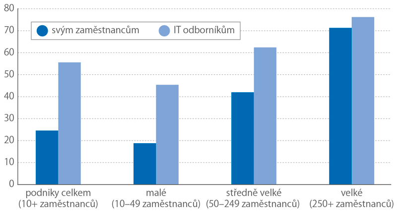 Pokud firmy svým zaměstnancům poskytují specializované školení v IT, přibližně stejně často zaměstnance vzdělávají jak v běžném používání IT (např. práce s kancelářskými programy nebo s internetem), tak v odborné práci s informačními technologiemi (např. programování, tvorba webových stránek nebo výuka programů specifických pro různé profese). Každou z těchto odpovědí uvedlo v průměru 18 % podniků. Podíl firem, které školí své zaměstnance v počítačových dovednostech, se zvyšuje s rostoucím počtem zaměstnanců. Školení v běžném používání IT poskytovaly v roce 2023 téměř dvě třetiny velkých podniků (63 %). Středně velkých firem bylo oproti velkým podnikům téměř dvakrát méně a malých dokonce skoro pětkrát méně než velkých. Možnost vzdělávání v odborné práci s IT poskytovalo v průměru 18 % podniků. Převažovaly ty velké (57 %), středně velkých byla třetina a malých firem 13 %.