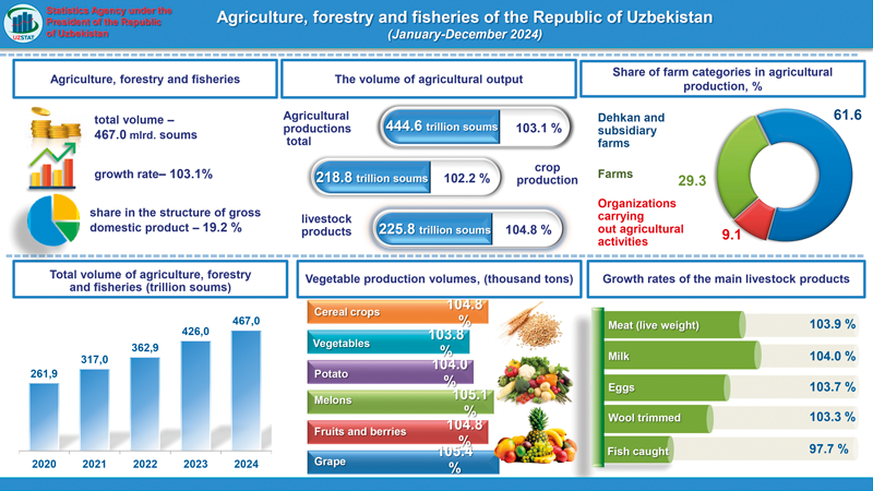 Základní přehled se zaměřuje na objemy pěstovaných plodin, zejména obilovin a zeleniny, a sleduje výkonnost chovu hospodářských zvířat. V roce 2024 se sektoru zemědělství, lesnictví a rybolovu dařilo, meziroční nárůst přesáhl 3% hranici (3,1 %). Největší podíl na celkovém výstupu mají soukromé farmy. S výjimkou rybolovu se na straně živočišné produkce dařilo všem sledovaným položkám, produkce mléka zaznamenala 4% meziroční nárůst. V oblasti rostlinné výroby byl největší meziroční nárůst zaznamenán u produkce vinných hroznů (+5,4 %), dařilo se i melounům (+5,1 %).